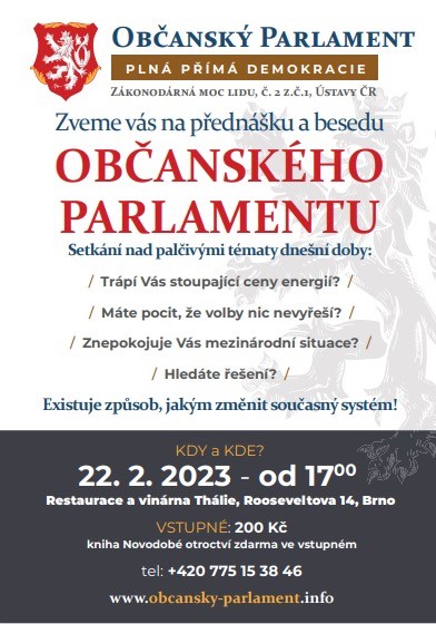 Občanský parlament se stále snaží zasévat informace o možnosti, jak do budoucna pojmout samotné řízení a směrování státu. Aktuálně se bude konat přednáška/beseda o práci Občanského parlamentu v Brně v restauraci Thálie (Rooseveltova 14, Brno 602 00) ve středu 22.2.2023 17:00hod.