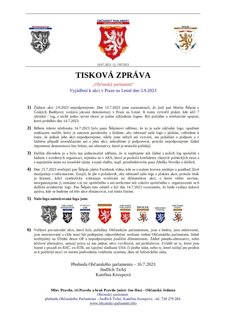 Občanský parlament, alternativa pro plnou přímou demokracii a zákonodárnou moc lidu, lidový orgán vzniklý na základě Ústavy ČR, čl.2, kde je řečeno, že veškerá moc je v rukou lidu, jasně odmítá a nepodporuje žádnou akci 3.9.2023, kterou pořádá jistý pan Martin Štěpán v Praze na Letné.