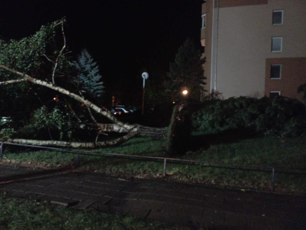 Naskytl se mi neskutečný pohled….těsně za oknem podél paneláku ležel smrk, který dosahoval skoro až do šestého patra, nyní tady ležel vyvrácený i s kořeny a za ním hned druhý smrk a třetí….kousek dál vyvrácená bříza a hned za ní další smrk….nejdelší z těch smrků zasáhl až do parkoviště, kde zcela zdemoloval jedno auto a další dvě lehce poškodil. V tu chvíli už houkali hasiči a za chvíli už bylo slyšet řezání motorových pil ve vedlejší ulici….jakmile přestalo aspoň trošku pršet, vyšla jsem se na to nadělení podívat.