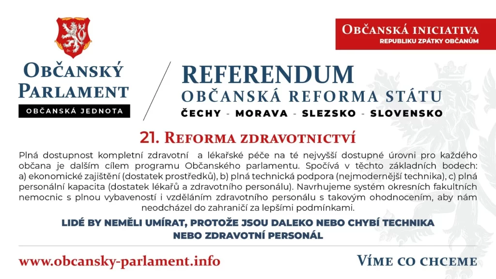 Občanský parlament má v Programu změnu systému zdravotnictví. Je jen otázka, kolik odborníků a občanů bude na této změně participovat a jak naplní Občanský parlament svoji úlohu – ne to, kdo, ale kdy. Bude to tehdy, pokud občané pochopí, co znamená plná přímá demokracie a zapojí se do rozhodování o věcech veřejných.